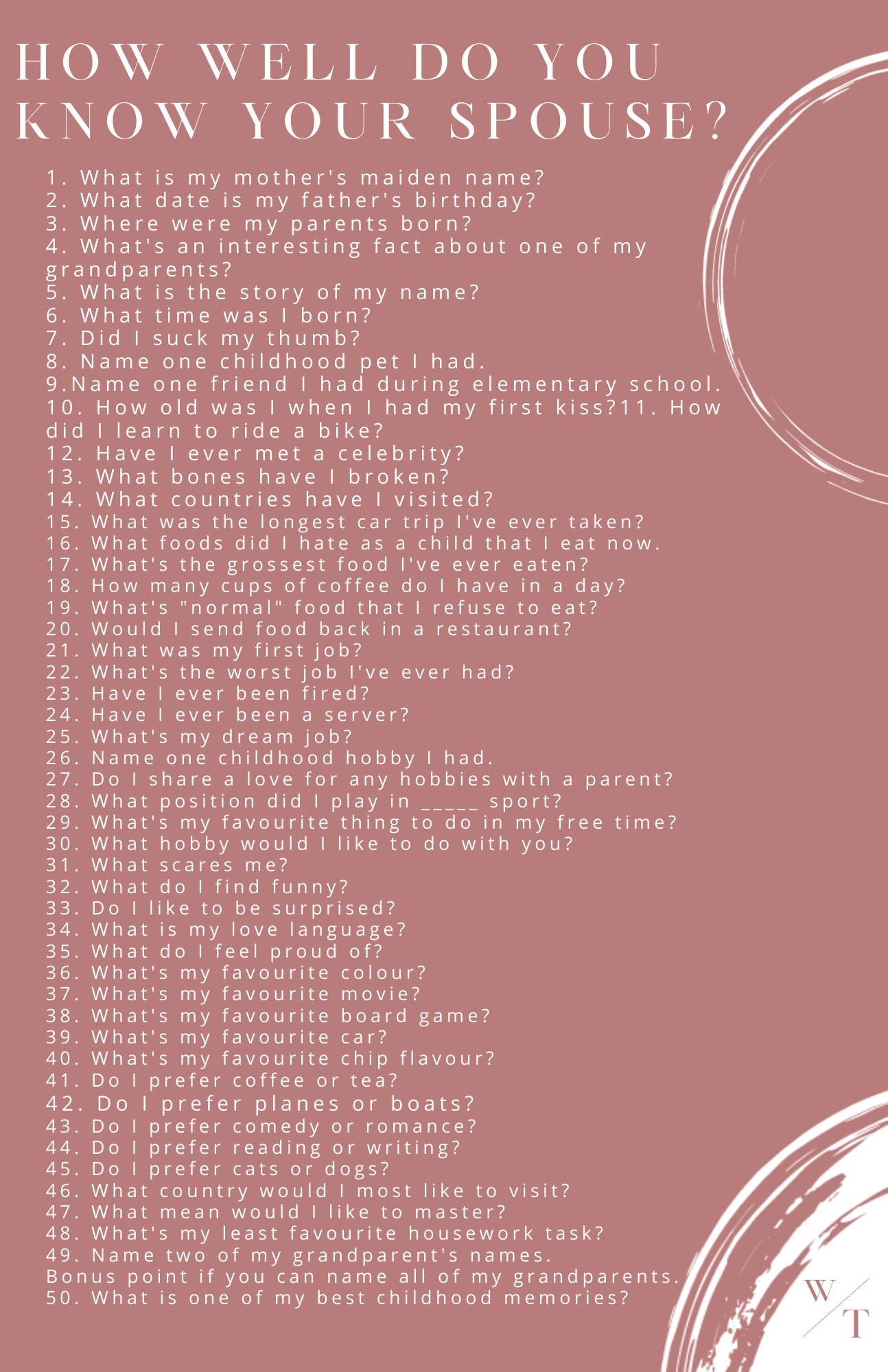 Are you competitive? You'll have some fun with the "How Well Do You Know Your Spouse?" game! There are lots of ideas on Pinterest Board here, or go download my list of questions below.